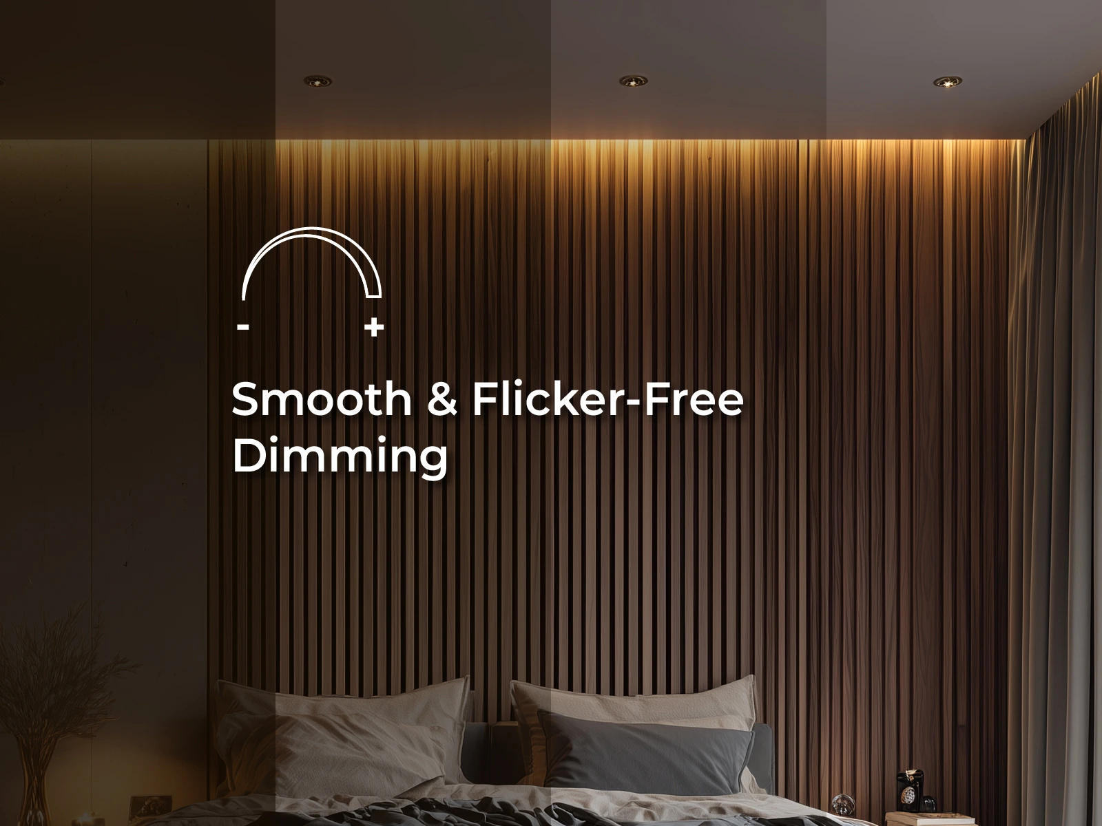 - Smooth, silent dimming using phase-cut technology (ELV / MLV / Triac)