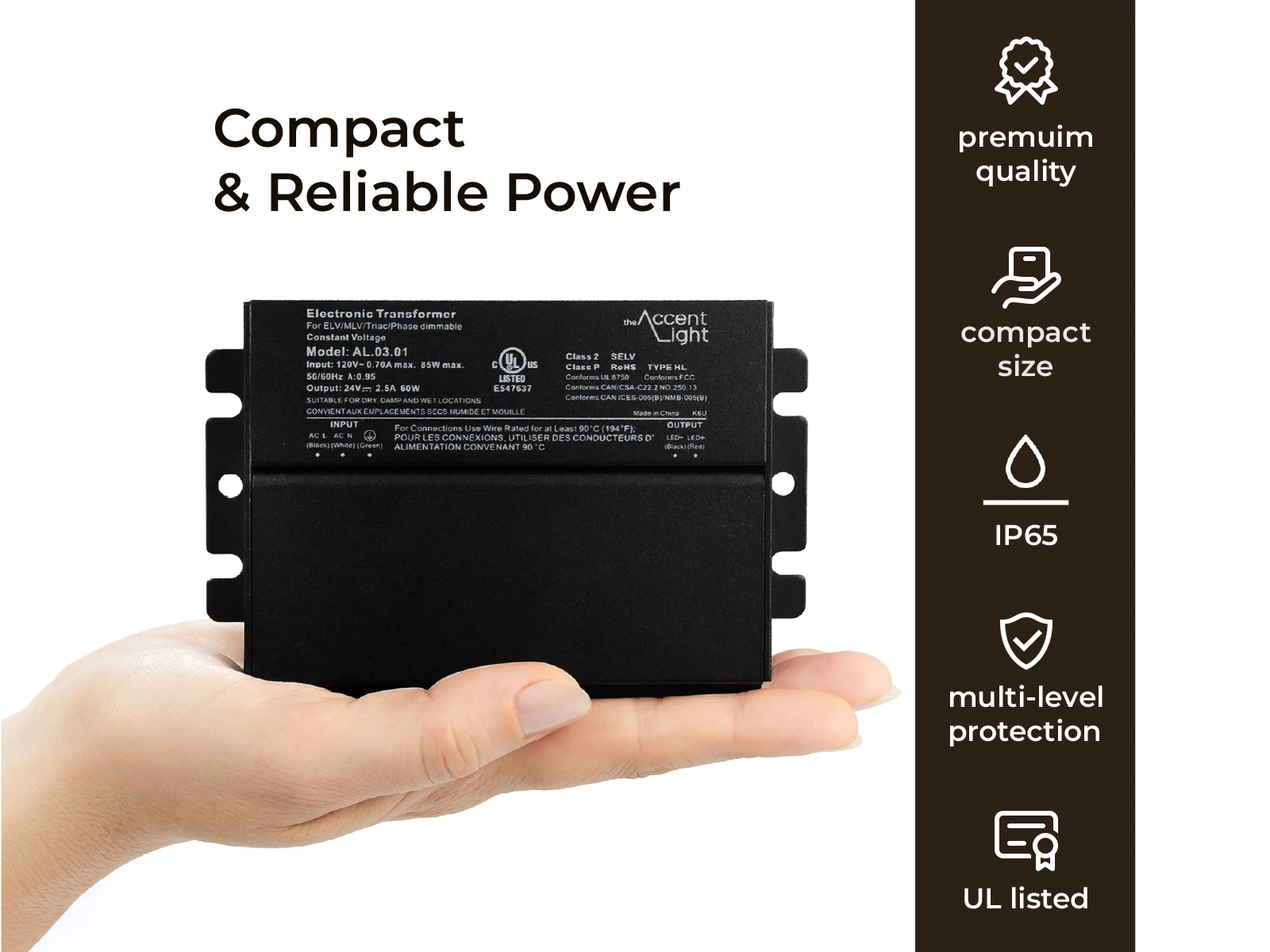 TheAccentLight 60W 24V Dimmable LED Driver is engineered for designers and installers who value performance, reliability, and a clean installation look.