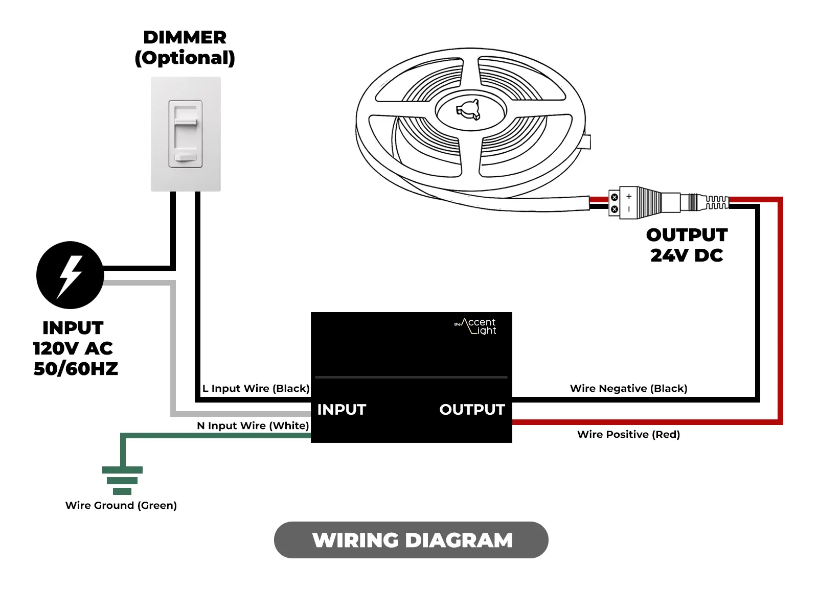 Designed specifically for our TheAccentLight 24V LED strip, this driver powers up to one full 16.4 ft (5 m) reel — approximately 52.5W total load — with an additional safety margin for stable dimming.